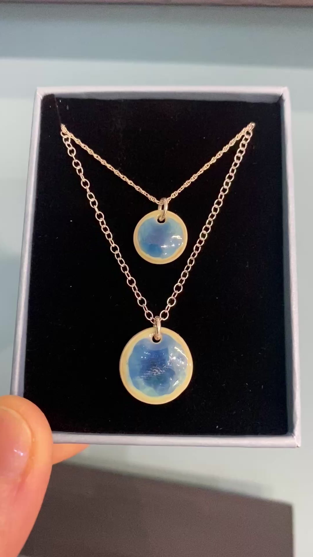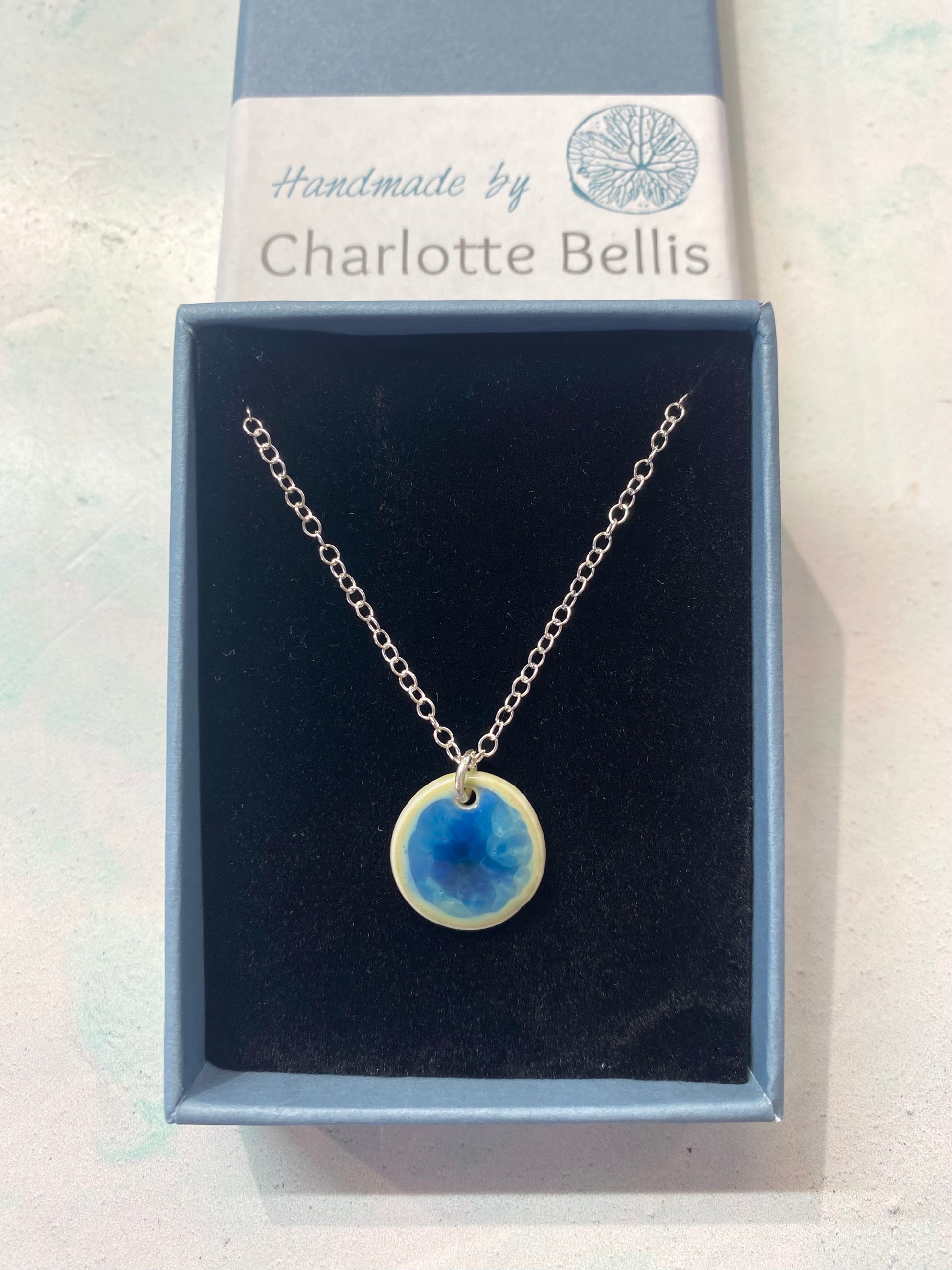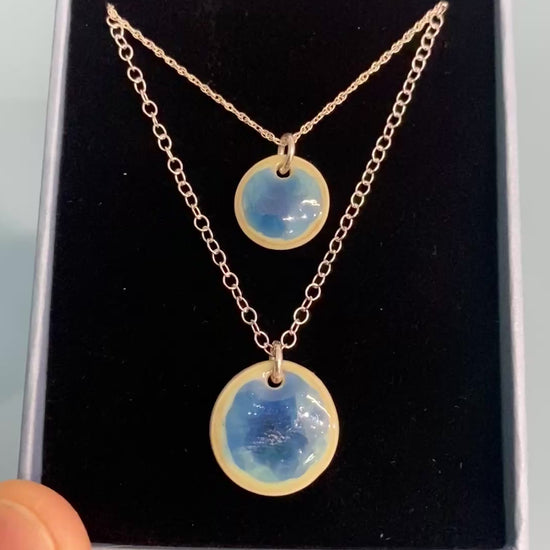 Mwclis disg syml gyda gwydredd cefnforol syfrdanol, wedi'i gynllunio i ganolbwyntio'r holl sylw ar liw syfrdanol a symudiad y crisialau o fewn y gwydredd. Mae'r gadwyn ar gael mewn tri maint gwahanol ar gadwyn arian sy'n cyd-fynd â maint y disg. Ar gael mewn tri gwahanol maint - Disg Bach 1cm, Disg Canolig 1.5cm neu Disg Mawr 2.5cm. Ac tri gwahanol hyd y gadwyn 16", 18" neu 20" Oherwydd nodweddion y gwydredd hwn, bydd lliwiau'r darnau bob amser yn wahanol yn dibynnu ar y symudiad grisial wrth eu tanio. Daw'r gemwaith wedi'i lapio mewn blwch naturiol wedi'i ailgylchu gyda chyfarwyddiadau gofal.