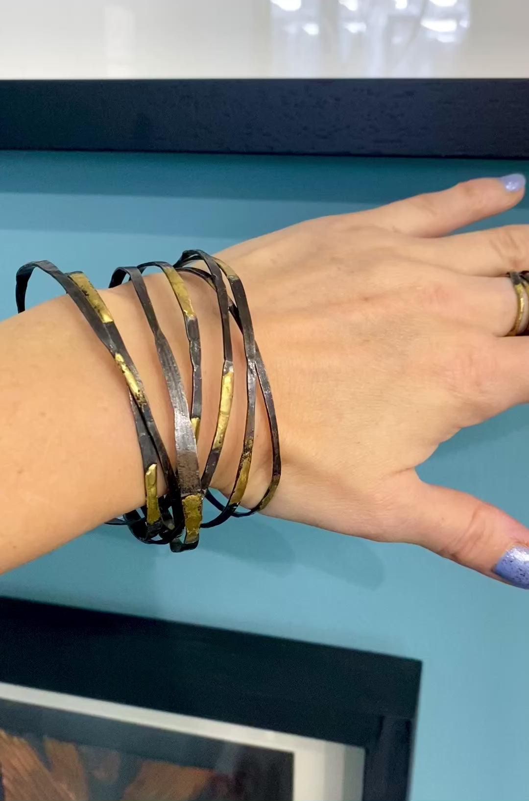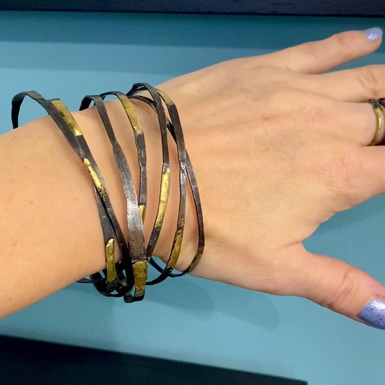 Wrapped iron bangle with 7 revolutions and a natural pattern like riven slate. Simply elegant with an organic ancient texture. Shiny brass accents dotted all around. From the 'Amrwd' (meaning Raw) collection.