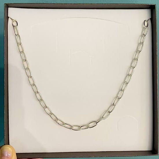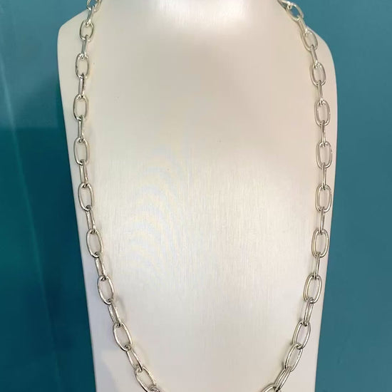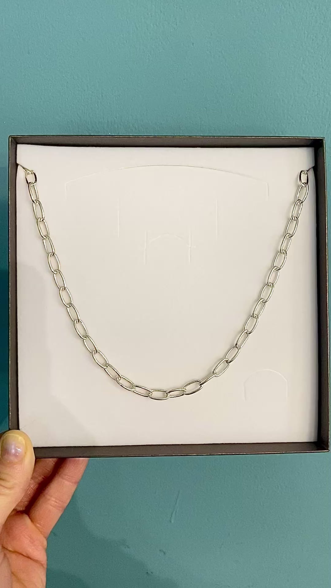 Materials: Solid Sterling Silver. Dimensions: 20inch length with silver clasp that compliments the chain.