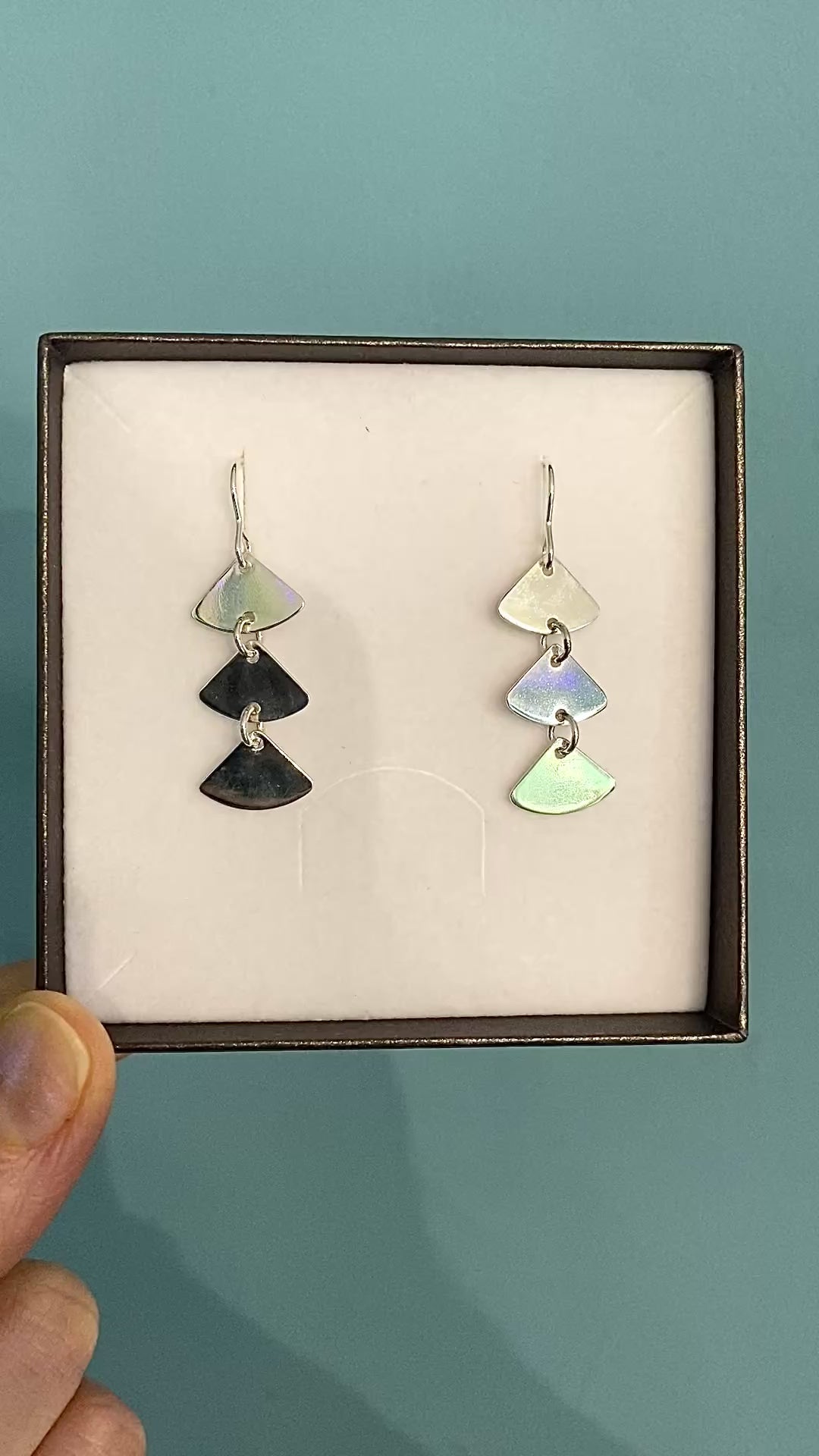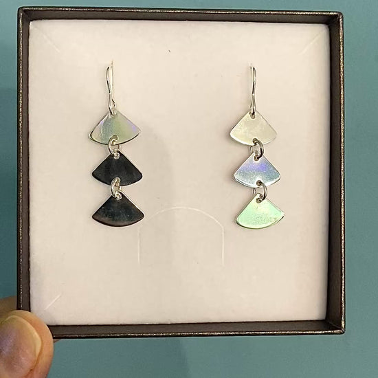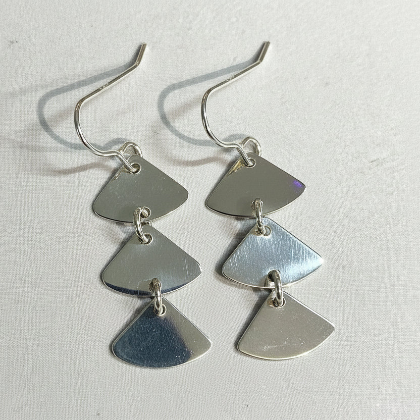 Eye-catching silver fan drop earrings. Part of the ‘Annwn’ collection, meaning the Otherworld - jewellery for the Modern Goddess, bold designs in bright sterling silver with geometric lines and curves. These silver fan earrings make a striking statement.