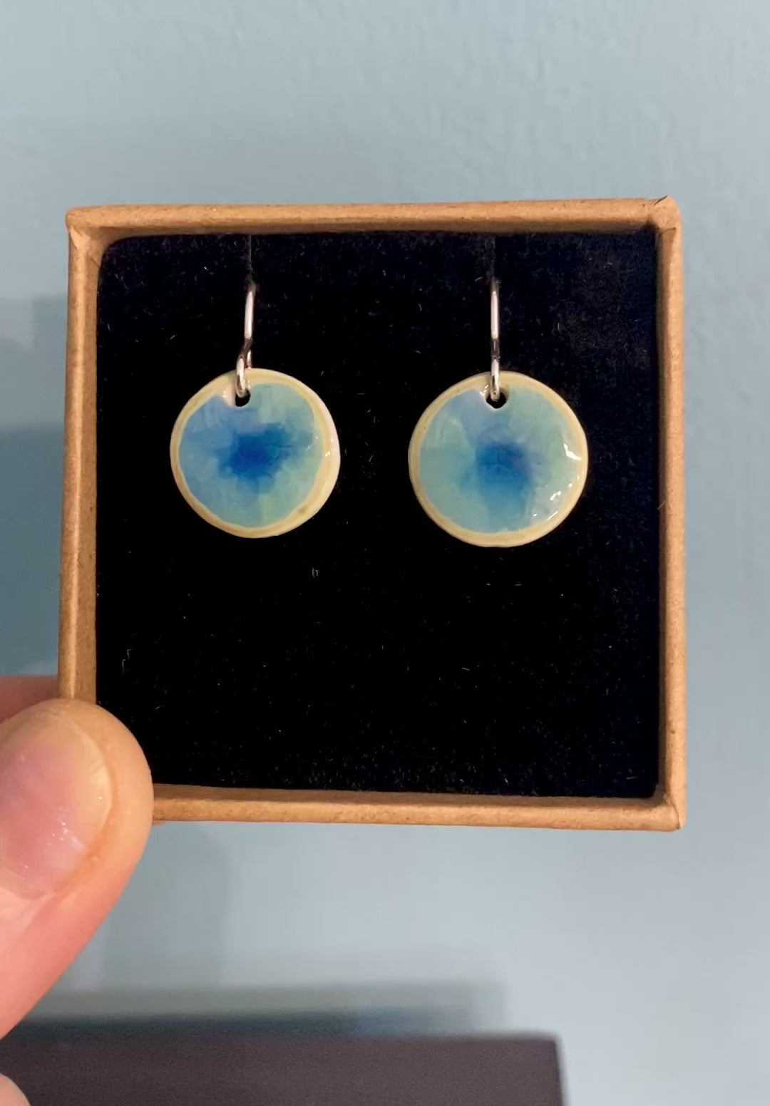 A simple disc earring designed to focus all the attention on the stunning colour and movement of the crystals within the glaze. All earrings come on a sterling silver hook wire with earring backings.