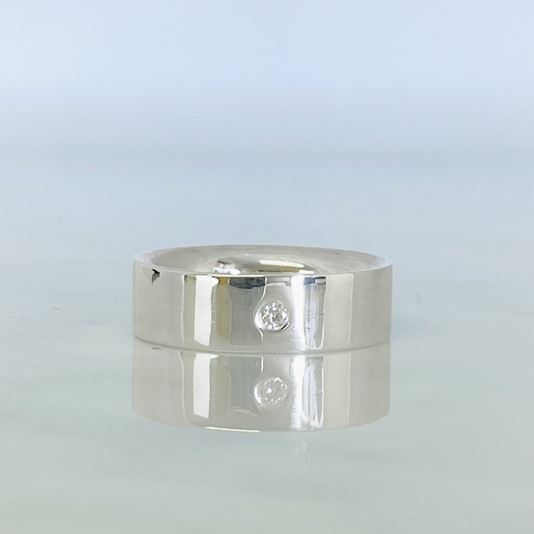 On the outside the ring has a high polished finish for maximum shine and a diamond is set within the band meaning it is entirely flat and smooth.