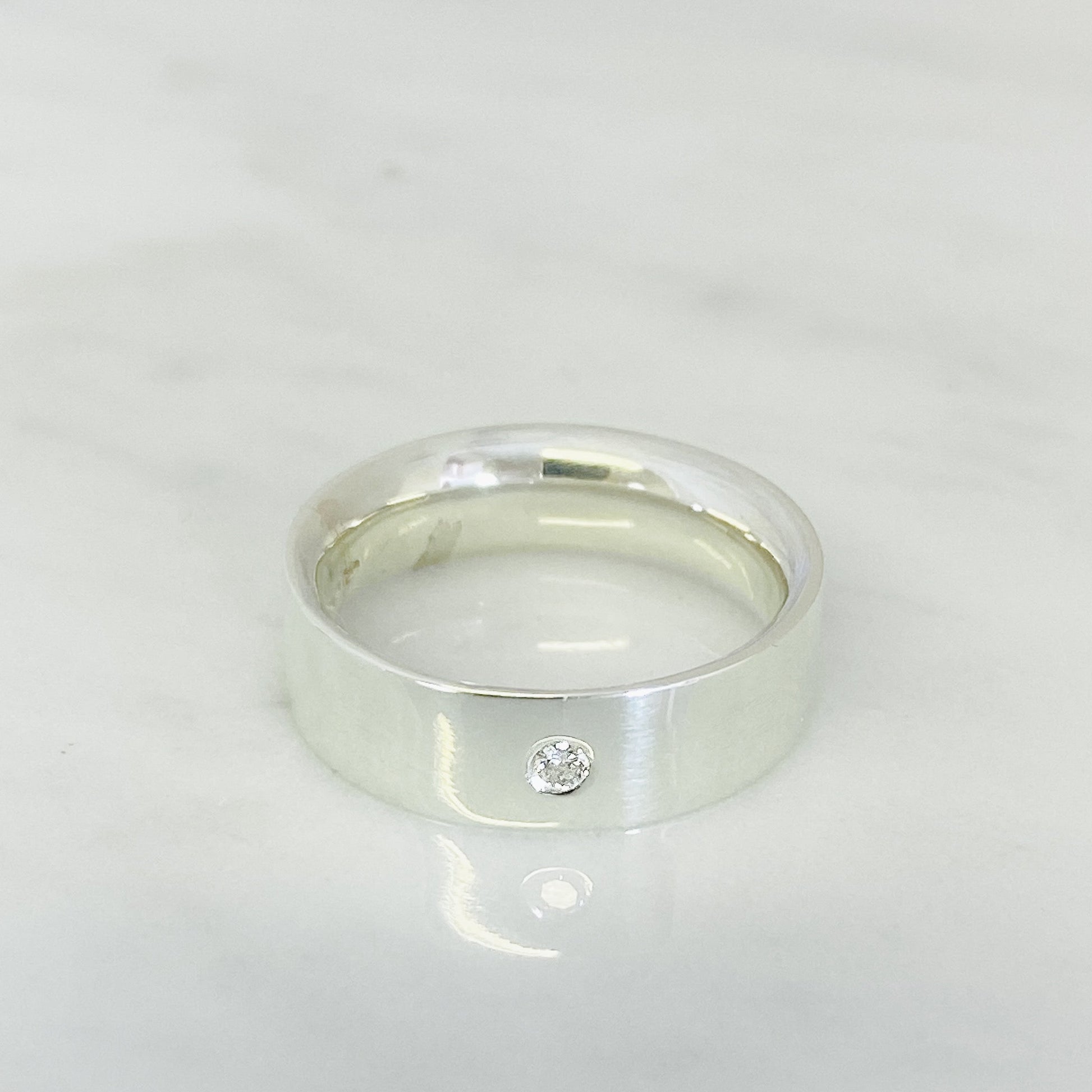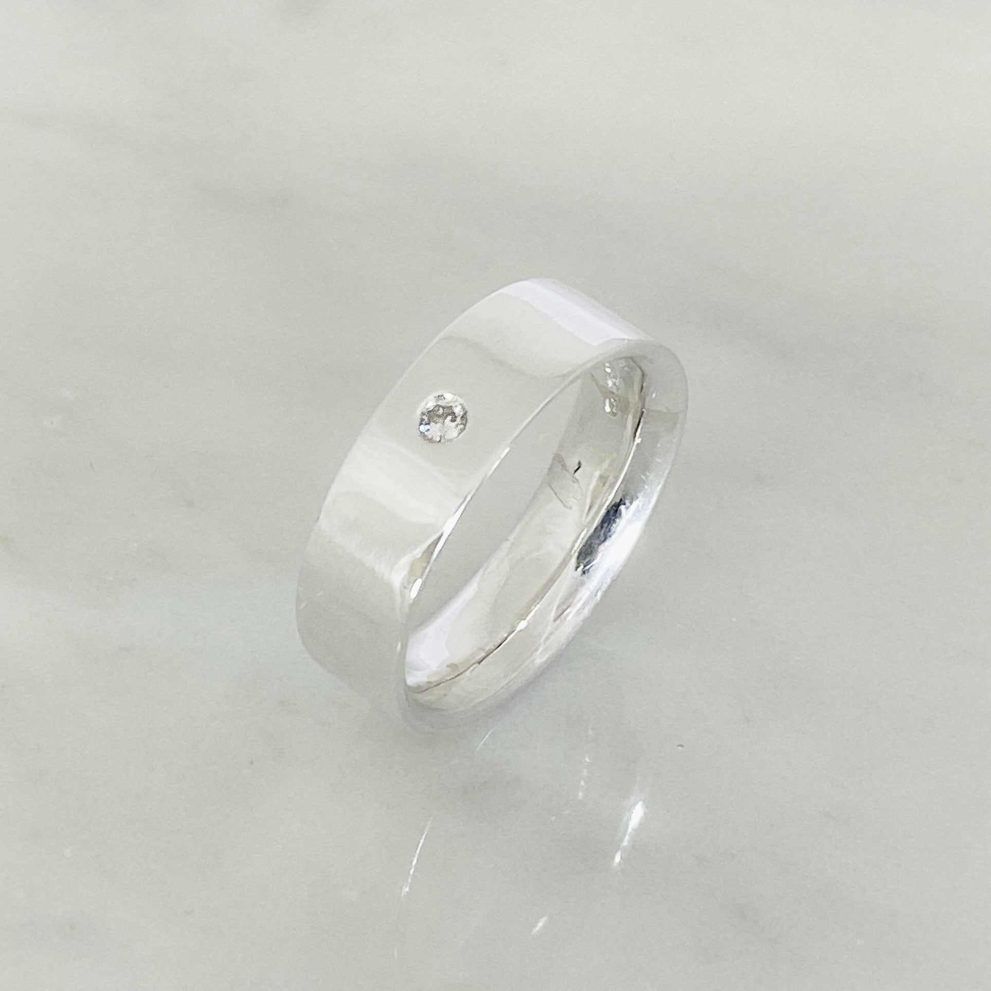 On the outside the ring has a high polished finish for maximum shine and a diamond is set within the band meaning it is entirely flat and smooth.