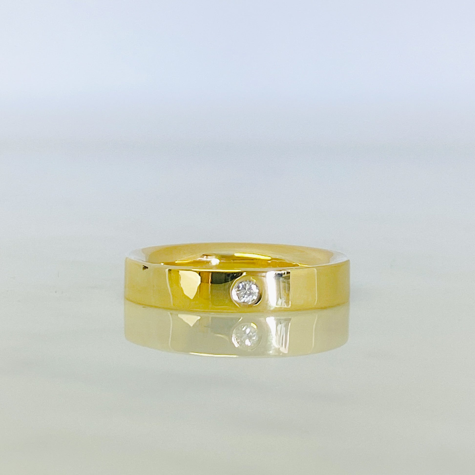 A contemporary take on a traditional ring in smooth polished yellow gold with a flush set sparkling diamond.