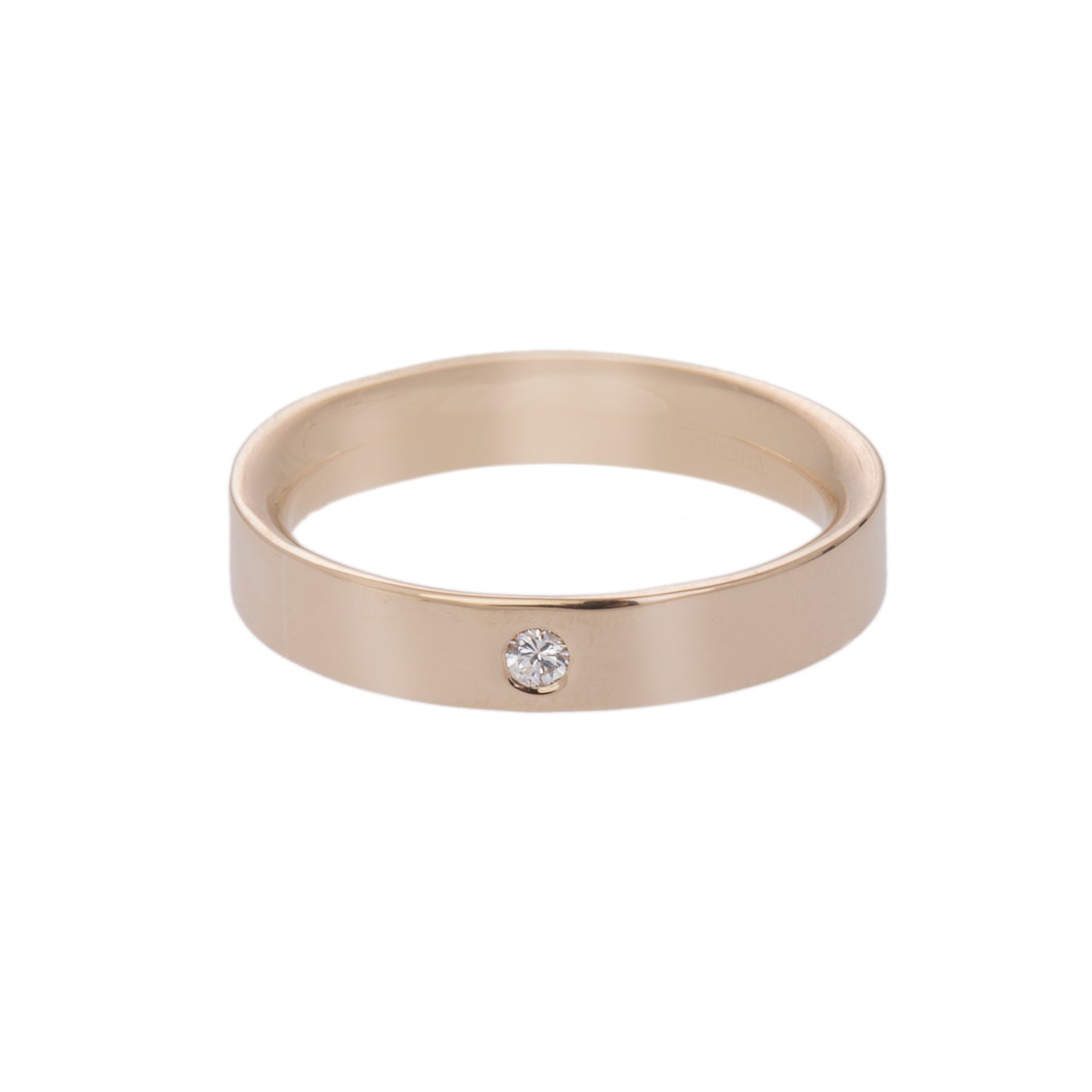 On the outside the ring has a high polished finish for maximum shine and a diamond is set within the band meaning it is entirely flat and smooth.