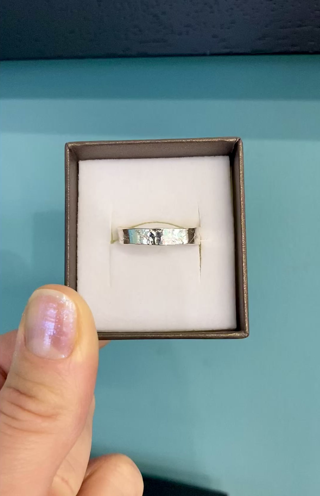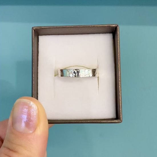 A slim and delicate silver textured ring with an organic natural pattern and glistening highlights.