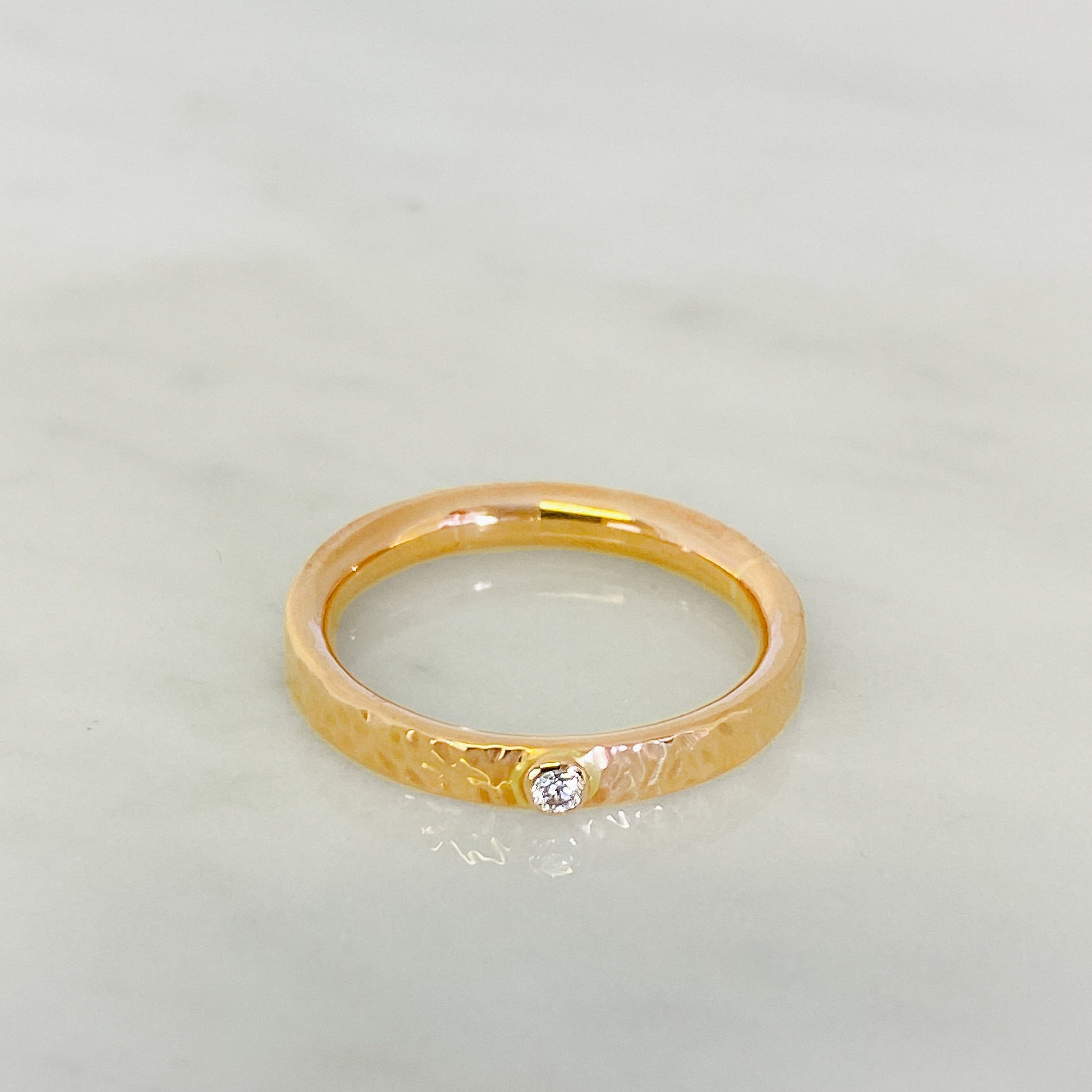 A contemporary take on a traditional ring in rose gold with a hand hammered texture on the surface giving a dimpled effect and a bezel set sparkling diamond.