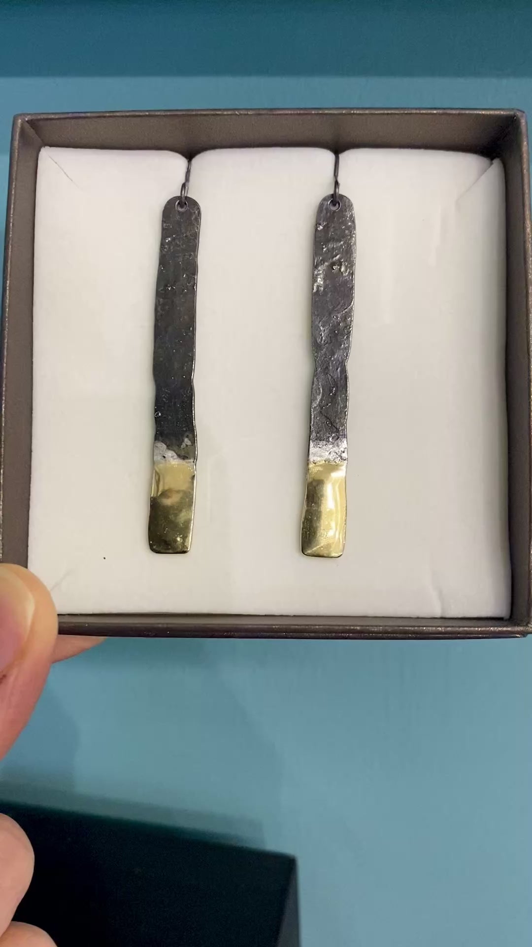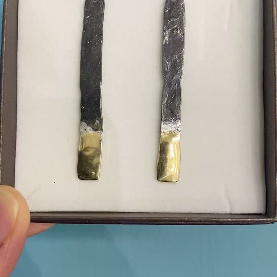 ‘Amrwd’ meaning raw has a lovely surface texture and is handmade in the forge where Ann makes these eye-catching and elegant long drop earrings. Hot forged iron with brass tip detail with organic textures on sterling silver ear hooks.
