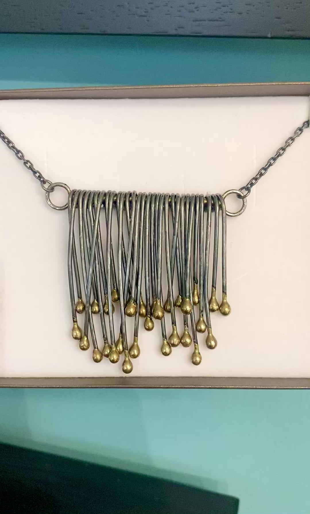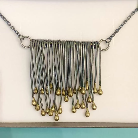 An eye-catching statement necklace with iron and brass strands that have movement.