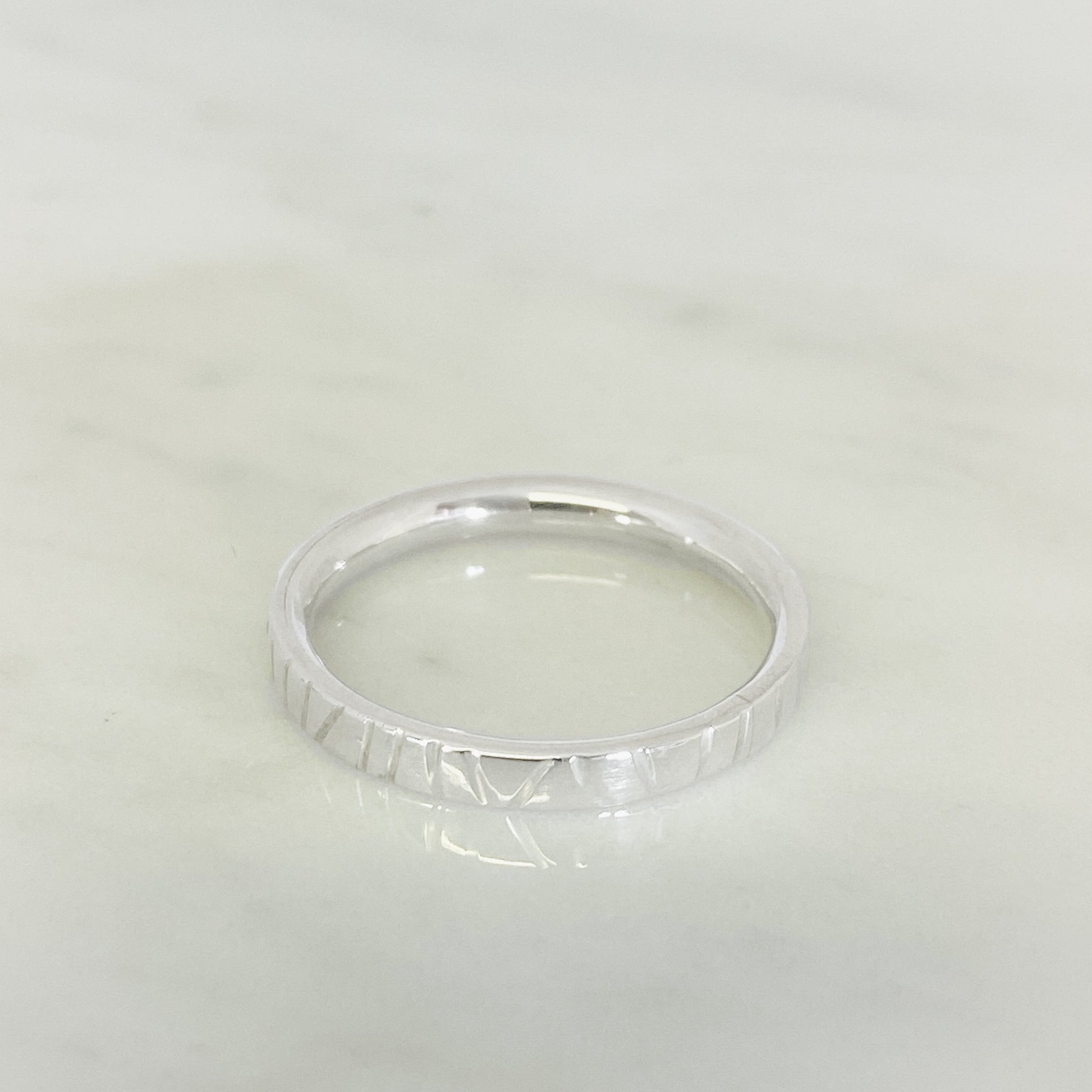 A contemporary take on a traditional ring in white gold with a hand drawn pattern adding interest to the surface.