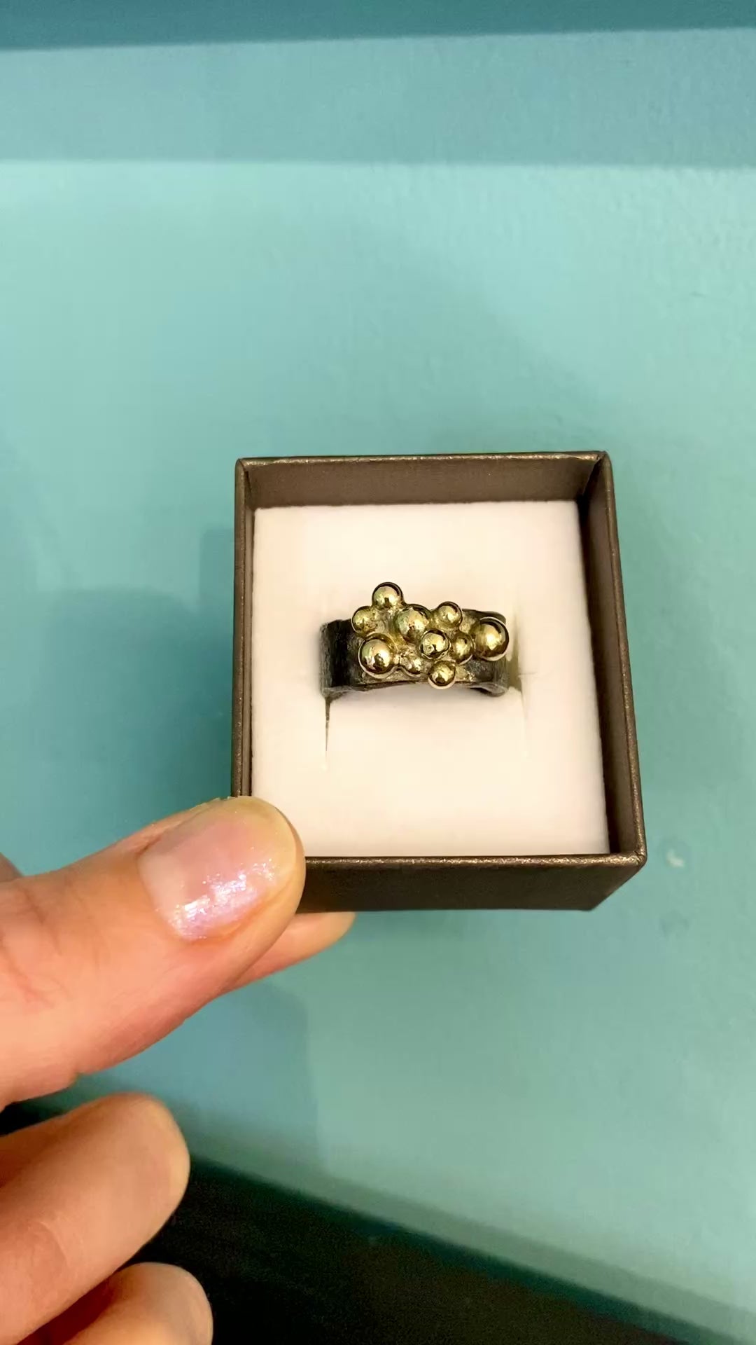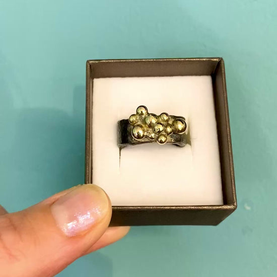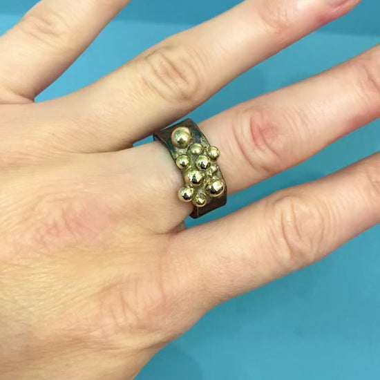 Black and gold colour, the surface is organic and natural, hammered with a texture which makes the ring seem ancient and earthy.