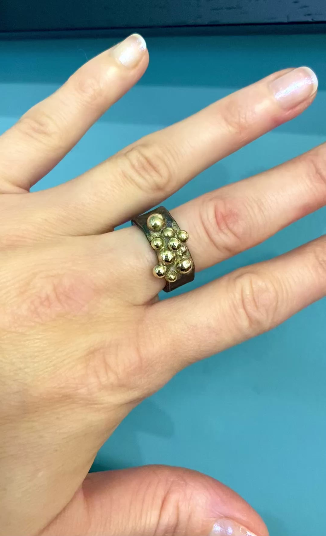 A bold organic ring which is part of the ‘Amrwd’ collection (meaning Raw). The ring is made out of iron with scattered brass balls that represent pollen over the front. A beautiful statement ring.