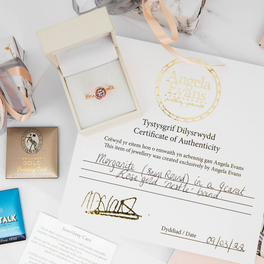 The finished, hallmarked ring arrives gift wrapped in one of our signature pearly white boxes. Delivery is made by a fully insured Royal Mail service.